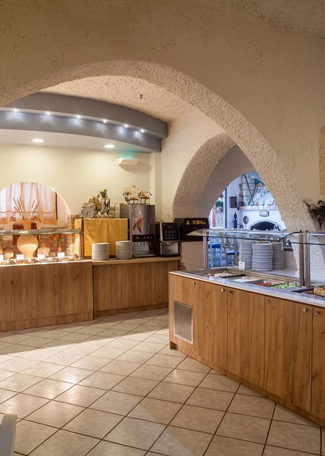 The restaurant offers a wide range of tasty dishes and can satisfy even the most demanding guests. In the hotel restaurant the guests can taste the local cuisine, all dishes prepared with the well-known Cretan art and local olive oil. The halfboard guests can enjoy a breakfast and dinner style buffet.